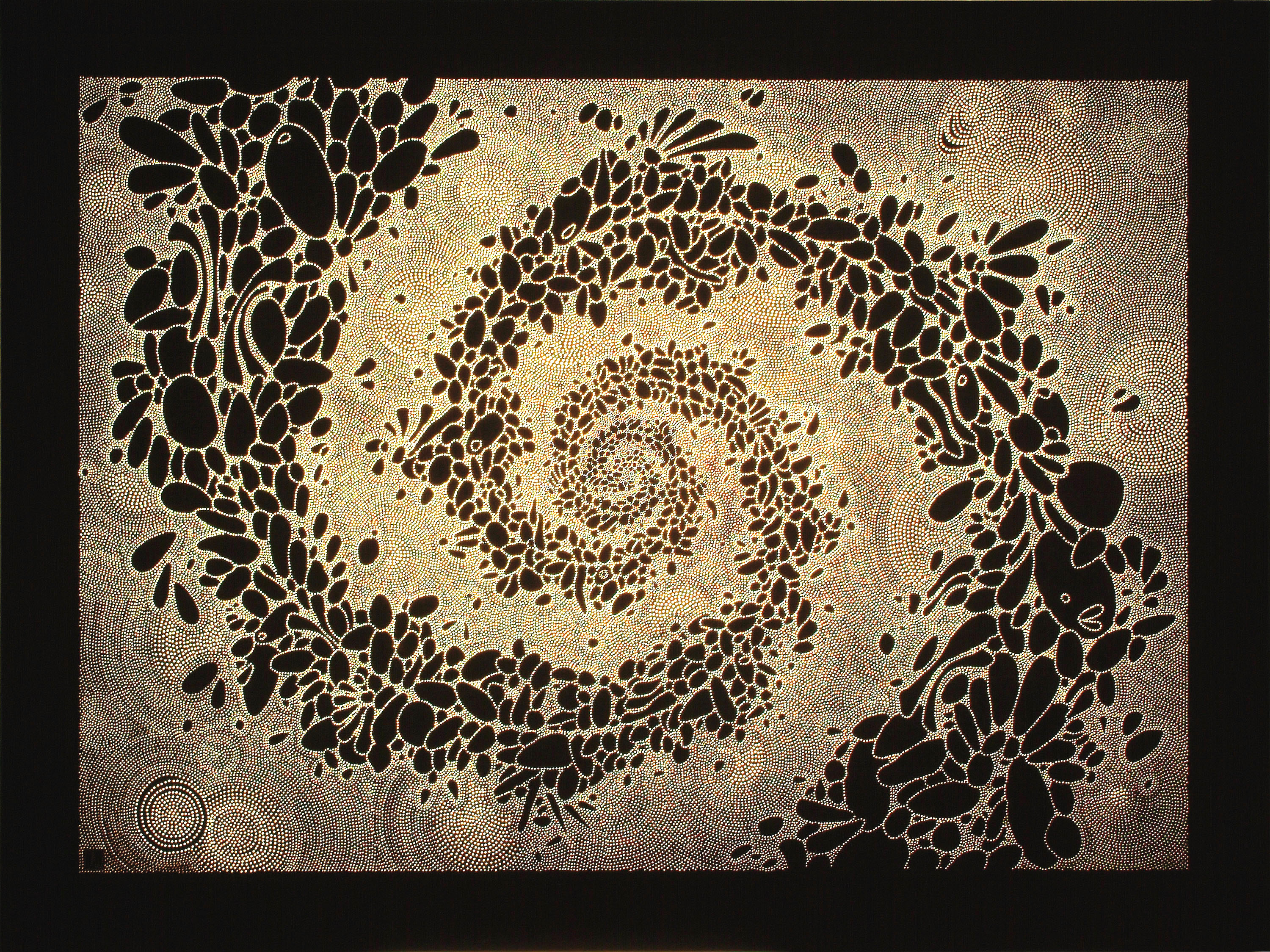 Recent work has involved less obvious use of the sequence, plotting grid patterns loosely following the rules but deliberately veering off to embrace organic flow when it feels right to do so. See ‘Flowering of Technology’ and ‘Fish Goddess Recycling The Earth’ below.
