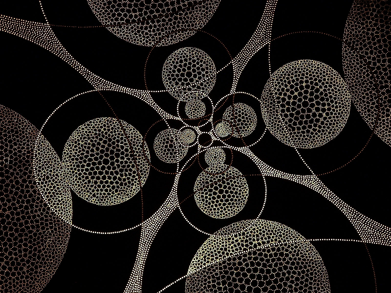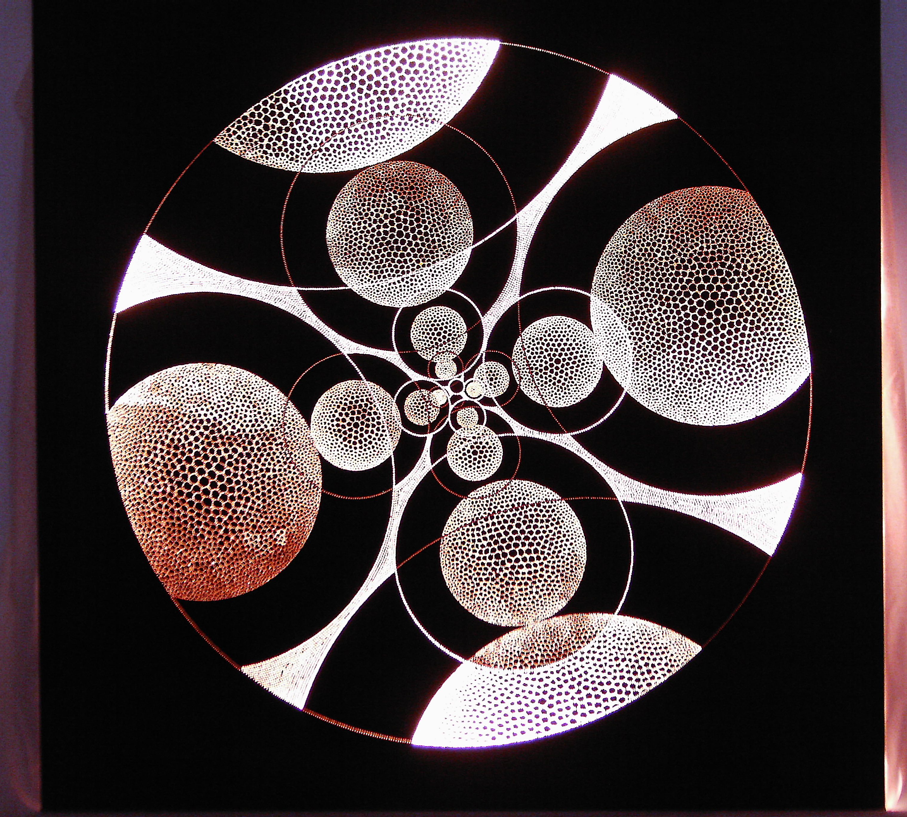ORBs (untitled) . By drawing two overlapping spiral grids and exchanging the squares created for circles, this orbital piece began to take shape. The variation in brightness is from angled drilling.ORBs (untitled)