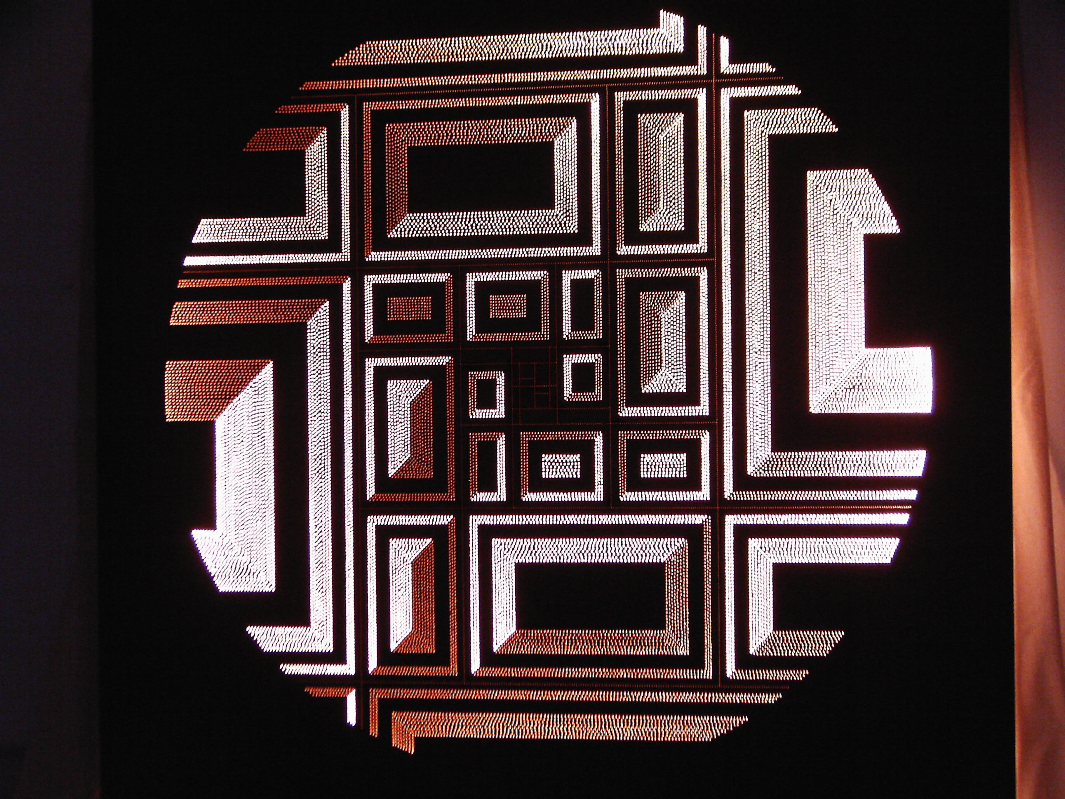 ‘Untitled’ A 1.2m square panel based upon the grids drawn in preparation to create spirals. Instead of continuing to create the spirals, I have emphasised the grids themselves and played upon their design. The shading is created by different angles being applied to the drilling which gives the 3 dimensional effect.