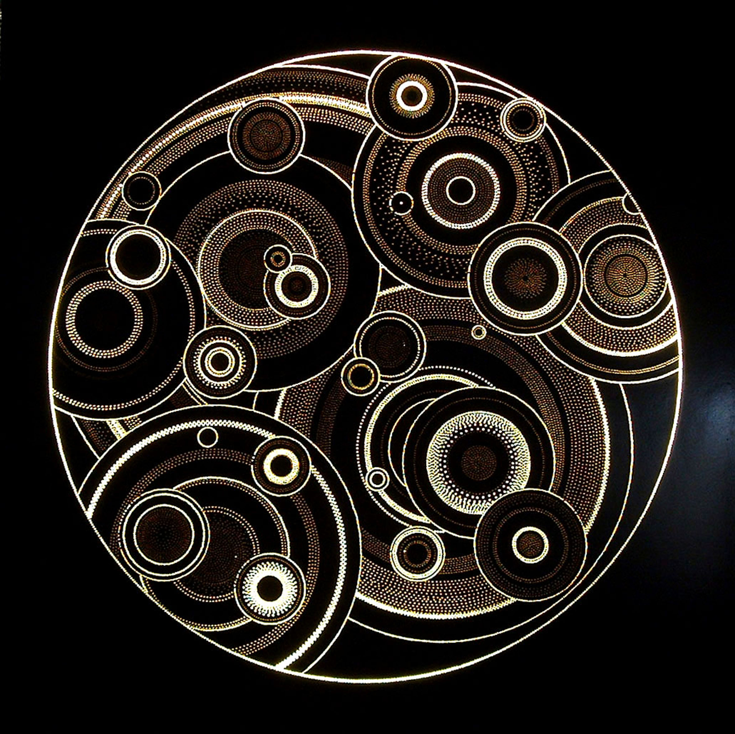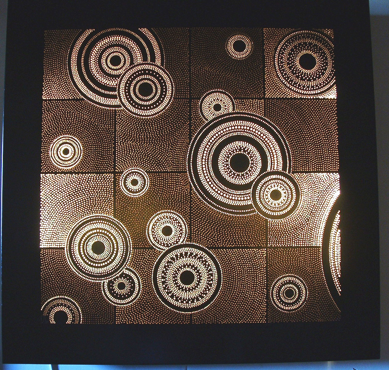 ‘Geometry’ 450mm x 450mm. One of the first drillworks panels. This simple circle and square pattern was drilled with left and right angles so the pattern changes depending where it is viewed from. Early pieces like this were hand finished by burning the board to remove debris and colour the surface followed by waxing and buffing. The border is painted black . Private collection
