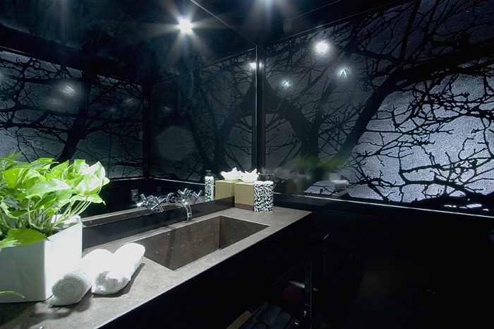 This dramatic bathroom on a Feadship features satin black drillwork panels installed around the walls.